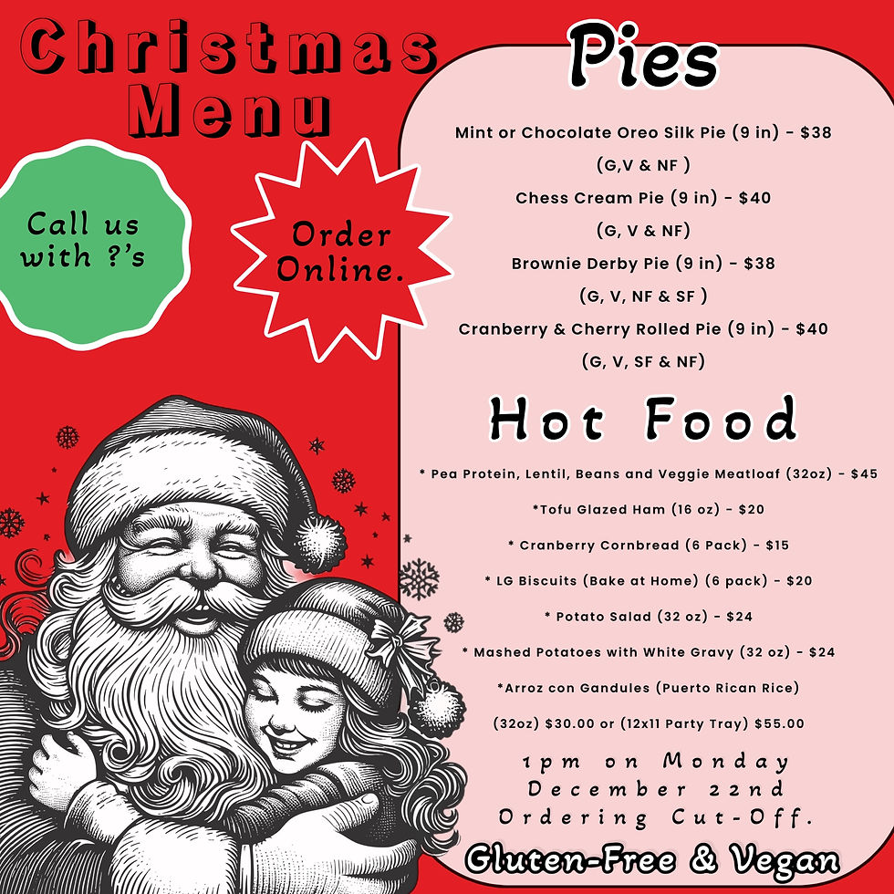 Please use the form below to place your Christmas Menu orders by Monday 12/22 at 1 pm. Pickups will be on 12/24 between 12-5 pm.